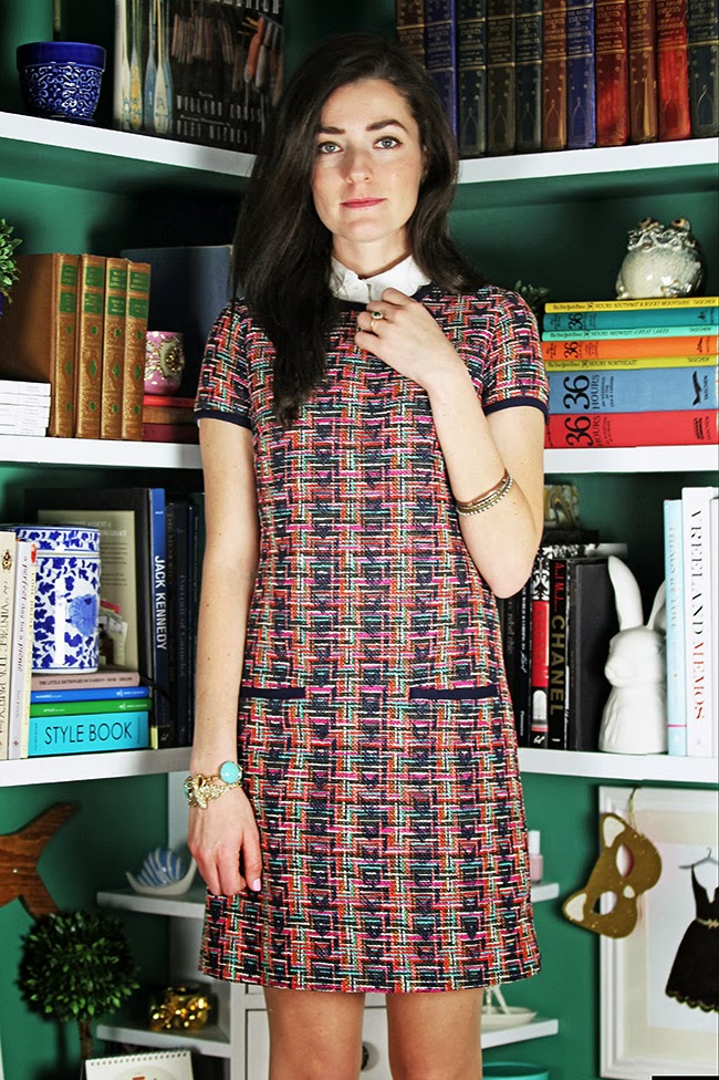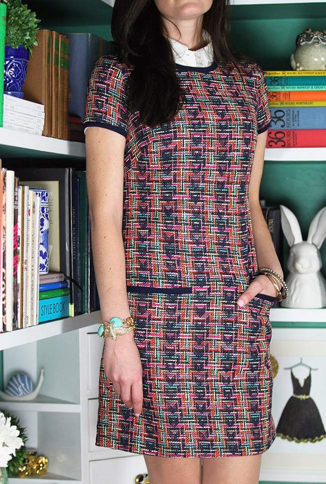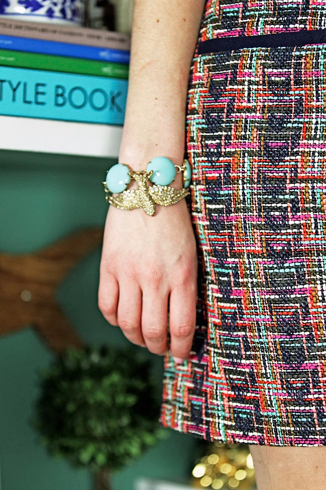 Dress: Shoshanna (similar) Shirt: Kate Spade (similar) Shoes: Ferragamo Bracelets: J.Crew, Loren Hopeย